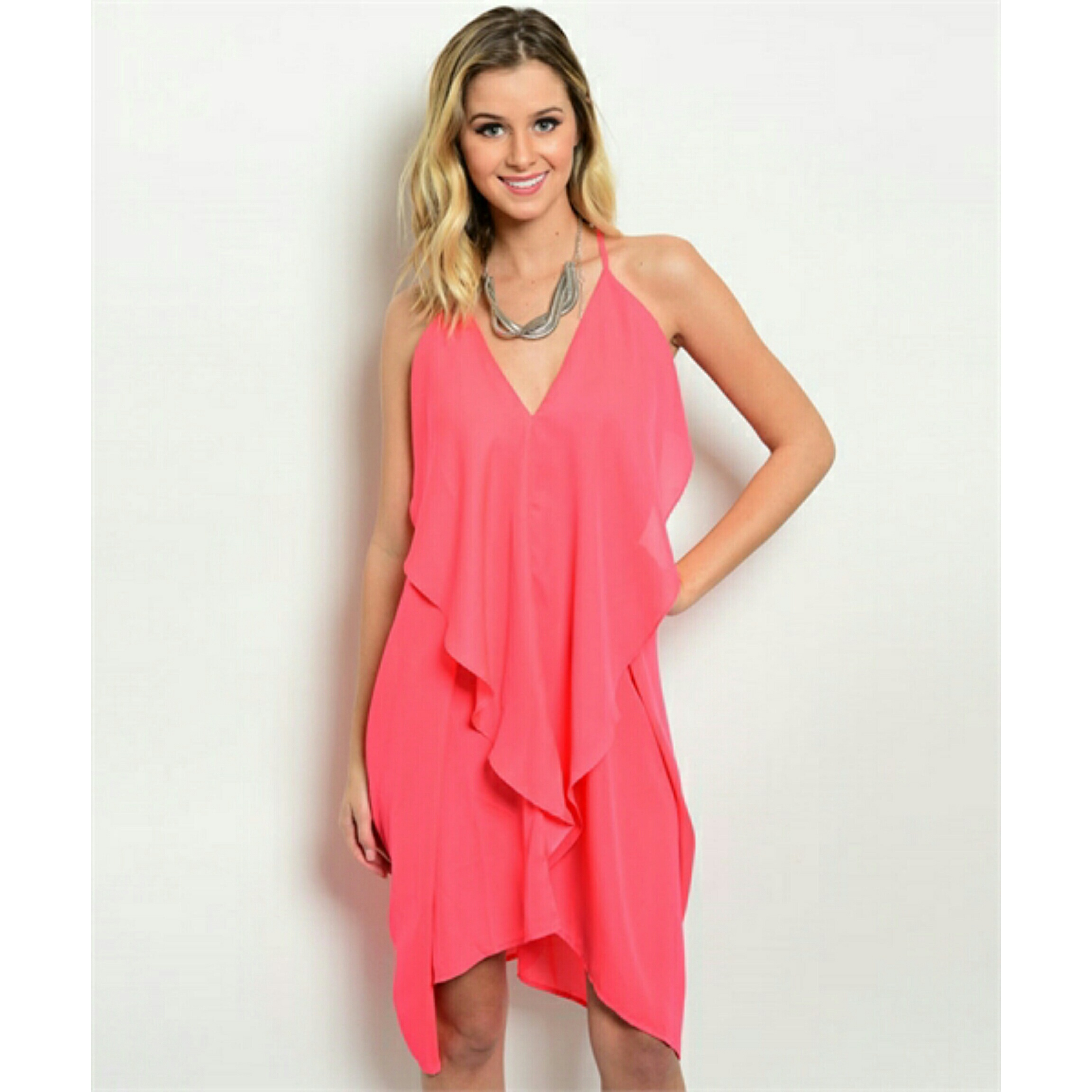 Loving our "Deep in Love " dress in vibrant coral! The gorgeous long ruffle front and cinched drape back will definitely be turning heads! Rayon